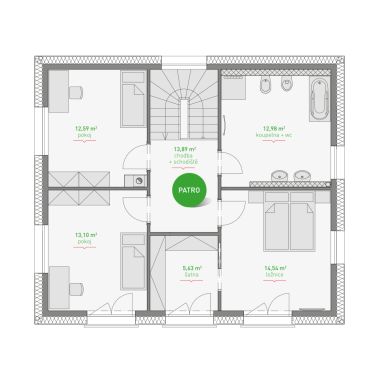 Do klidové části domu v patře s plnohodnotnou výškou vás ze spodní chodby dovede schodiště. Hlavní ložnice má k dispozici soukromý přístup do přilehlé šatny. Další dvě o něco menší ložnice jsou zamýšlené jako dětské pokoje. Poslední místností je velká koupelna s vanou, sprchovým koutem, dvěma umyvadly, WC a bidetem.