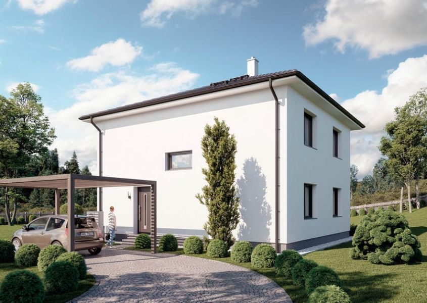 Medea je středně velký dům s plnohodnotným patrem určený pro komfortní bydlení rodiny s až 5 členy. Díky možnosti volby mezi sedlovou a valbovou střechou bez obtíží zapadne do jakékoliv zástavby.