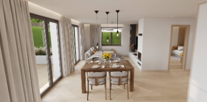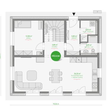 Denní část je situovaná v přízemí, zatímco noční, klidová zóna je umístěna v patře. Prostorné zádveří nabízí funkci šatny a první úložné prostory. Přímo ze zádveří je přístupná prostorná technická místnosti s místem pro pračku, sušičku i kompaktní jednotku (tepelné čerpadlo, ventilační jednotka s rekuperací a příprava teplé vody). Hned vedle je plnohodnotná koupelna se sprchovým koutem, umyvadlem a WC. Dalšími dveřmi vejdete do chodby, která přímo navazuje na hlavní obytný prostor vytvořený pro obývací pokoj, kuchyňský kout a prostor pro jídelní stůl. Troje dvoukřídlé francouzské dveře z kuchyňské, jídelní i obývací části místnosti zajišťují přístup na terasu i dokonalé prosvětlení místnosti. Pro zvýšení kapacity úložných prostor lze využít i místo pod schodištěm, které lze volitelně uzavřít.