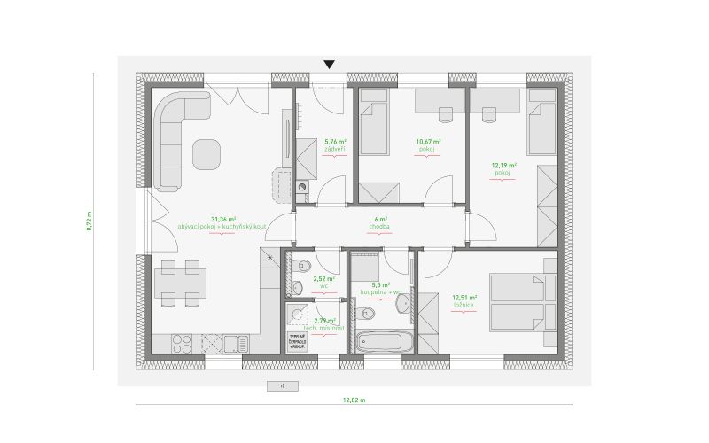 Zádveřím, které je z praktických důvodů od zbytku domu odděleno dveřmi, procházíme do centrální chodby spojující všechny místnosti v domě. Dominantním prvkem denní části domu je velký obývací pokoj spojený s kuchyňským koutem do “L” a jídelním stolem. Dvoje velké dvoukřídlé francouzské dveře zajišťují přístup na zahradu a dostatek světla i pro takto velkou místnost. Hned vedle obývacího pokoje je k dispozici samostatné WC s umyvadlem a za ním příčkou a dveřmi oddělená technická místnost s prostorem pro pračku, sušičku i kompaktní jednotku (tepelné čerpadlo, ventilační jednotka s rekuperací a příprava teplé vody). Plnohodnotná koupelna s vanou, sprchovým koutem, umyvadlem a WC se nachází hned vedle samostatného WC. Zadní, klidová část domu je věnována třem podobně velkým ložnicím.
