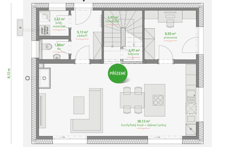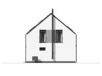 Vchodové dveře vás zavedou do zádveří, které nabízí praktický přístup do technické místnosti a také na toaletu. Dalšími dveřmi se vchází do prostorné obytné místnosti - obývacího pokoje s kuchyňský koutem. Dvoje posuvné dveře zajišťují dostatek světla i pohodlný přístup na terasu. Z kuchyňské části můžete projít do místnosti s vlastním přístupem na zahradu, která může pohodlně sloužit třeba jako pracovna, herna, případně pokoj pro hosty. Hned vedle je umístěno schodiště, pod kterým lze uzavřít jinak těžko využitelný prostor a vytvořit tak místo pro ukládání nářadí, úklidových potřeb a podobně.