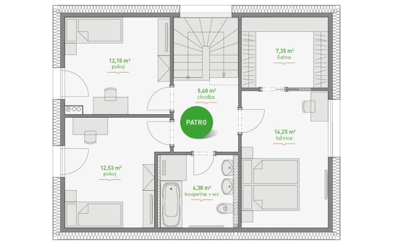 Po schodišti vyjdete do klidové části domu, která zahrnuje plnohodnotnou koupelnu s vanou, sprchovým koutem, dvojitým umyvadlem a WC. Dále jsou na patře 3 pokoje. Největší ložnice má k dispozici prostornou šatnu. Další dva pokoje lze využít jako dětské pokoje.