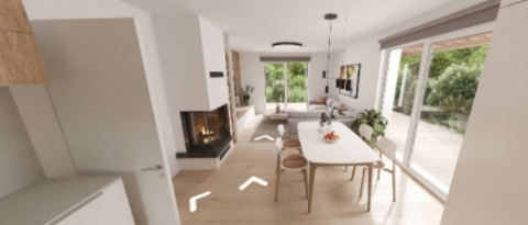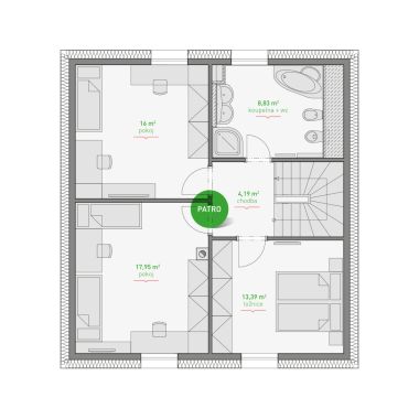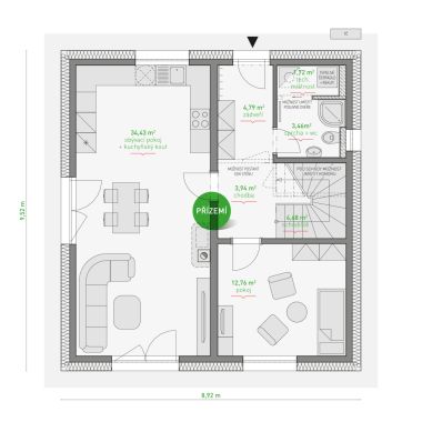 Zádveří nabízí nejen prostor pro odložení bot a svršků, ale také přístup do plnohodnotné koupelny se sprchovým koutem, umyvadlem a WC. Koupelna je spojená s technickou místností s pračkou, sušičkou i kompaktní jednotkou, jejíž součástí je tepelné čerpadlo, ventilační jednotka s rekuperací a příprava teplé vody. Dále do domu se pokračuje chodbou, která otevírá prostor nejen ke schodišti, ale také přístup do dalších dvou místností. Prostorný obývací pokoj s kuchyňským koutem je prosvětlen kromě okna v kuchyni také dvěma dvoukřídlými francouzskými dveřmi vedoucími na terasu na dvou stranách domu. Sousední pokoj s výměrou cca 13 m2 nabízí možnost pro vybudování ložnice, pracovny nebo pokoje pro hosty. Prostor pod schodištěm lze snadno uzavřít a vytvořit tak komoru pro ukládání úklidového vybavení či sezónních věcí.