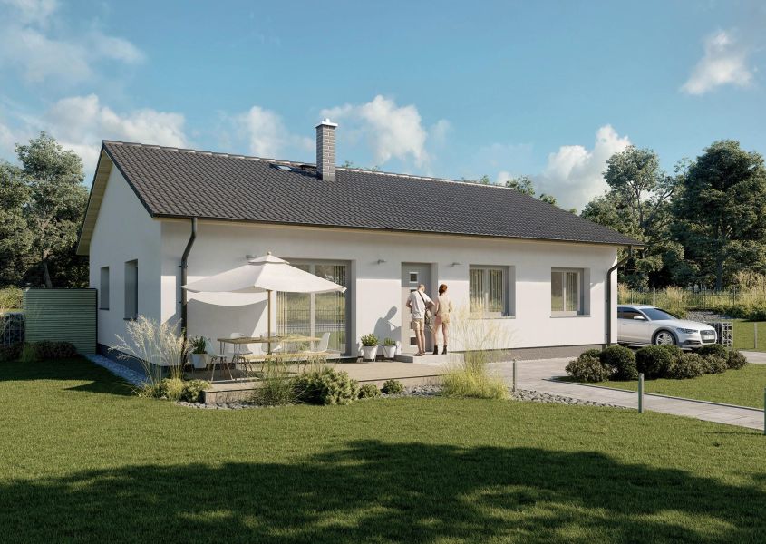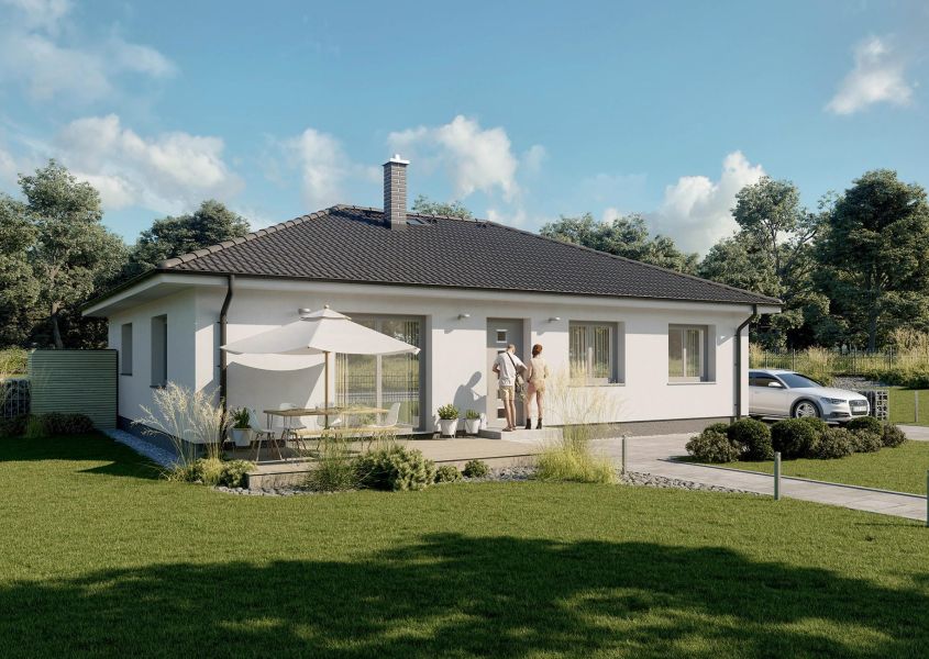 Prometheus je středně velký přízemní dům, který bude díky podlahové ploše 110 m2 a účelně uspořádané dispozici 4+kk vyhovovat čtyřčlenné rodině. Díky možnosti volby mezi sedlovou a valbovou střechou bez obtíží zapadne do jakékoliv zástavby.