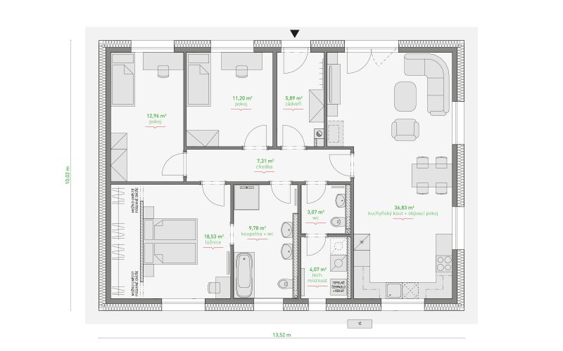 Po vstupu do domu Prometheus vás přivítá prostorné zádveří, ze kterého se vchází do dlouhé chodby spojující všechny místnosti v domě. Denní část domu je umístěna blízko vchodu, zatímco noční klidová část s ložnicemi je umístěna dále. První dveře vedou do prostorného obývacího pokoje s velkou kuchyní, resp. kuchyňským koutem a prostorem pro jídelní stůl. Z obývací části je díky dvoukřídlým francouzským dveřím přístup na terasu. Vedle obývacího pokoje je samostatné WC a umyvadlem a technická místnost s prostorem pro pračku, sušičku i kompaktní jednotku (tepelné čerpadlo, ventilační jednotka s rekuperací a příprava teplé vody), které jsou od sebe oddělené příčkou a dveřmi. Další místností je prostorná koupelna s vanou, sprchovým koutem, umyvadly a WC. Navazuje hlavní ložnice s prostornou šatnou přístupnou ze dvou stran. Sousedí se dvěma dalšími pokoji, v nichž lze vytvořit dětské pokoje, pracovnu nebo pokoj pro hosty.