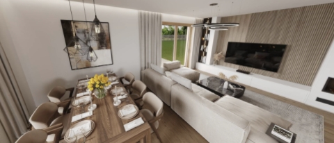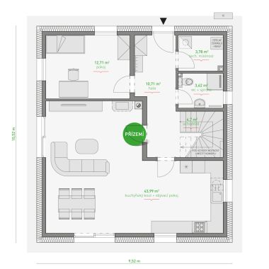 Podobně jako ostatní Domy jedním tahem má i Triton velmi účelnou a praktickou dispozici. Vchodovými dveřmi vejdete do prostorné haly, z níž se dostanete do všech místností v přízemí. Najdete tu technickou místnost, do níž se bez problémů vejde pračka, sušička i kompaktní jednotka s tepelným čerpadlem, ventilační jednotkou s rekuperací a přípravou teplé vody. Hned vedle najdete plnohodnotnou koupelnu s WC a sprchovým koutem. Naproti koupelně je vstup do prvního pokoje, který může sloužit nejen jako ložnice, ale také jako pokoj pro hosty nebo pracovna. Vstup do prostorného obývacího pokoje s velkorysým kuchyňským koutem je řešen hned dvěma dveřmi naproti schodišti. Díky dvěma posuvným francouzským dveřím je zajištěno nejen perfektní prosvětlení místnosti, ale také pohodlný výstup na terasu na dvou stranách domu.