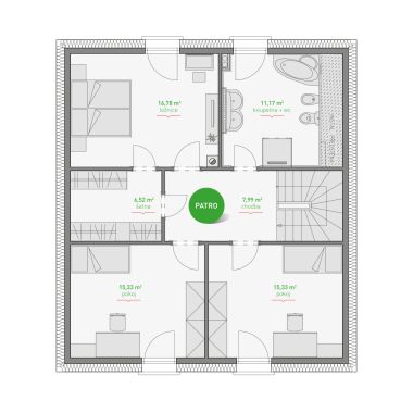Do obytného podkroví, v němž je umístěna klidová část domu, vede schodiště, pod nímž lze vytvořit praktickou komoru. Naproti schodišti jsou umístěny dveře vedoucí do prostorné šatny, která je také přístupná z největší ložnice. Ty jsou na patře celkem tři. Poslední místností je prostorná koupelna s vanou i sprchovým koutem, dvojumyvadlem, WC a bidetem.