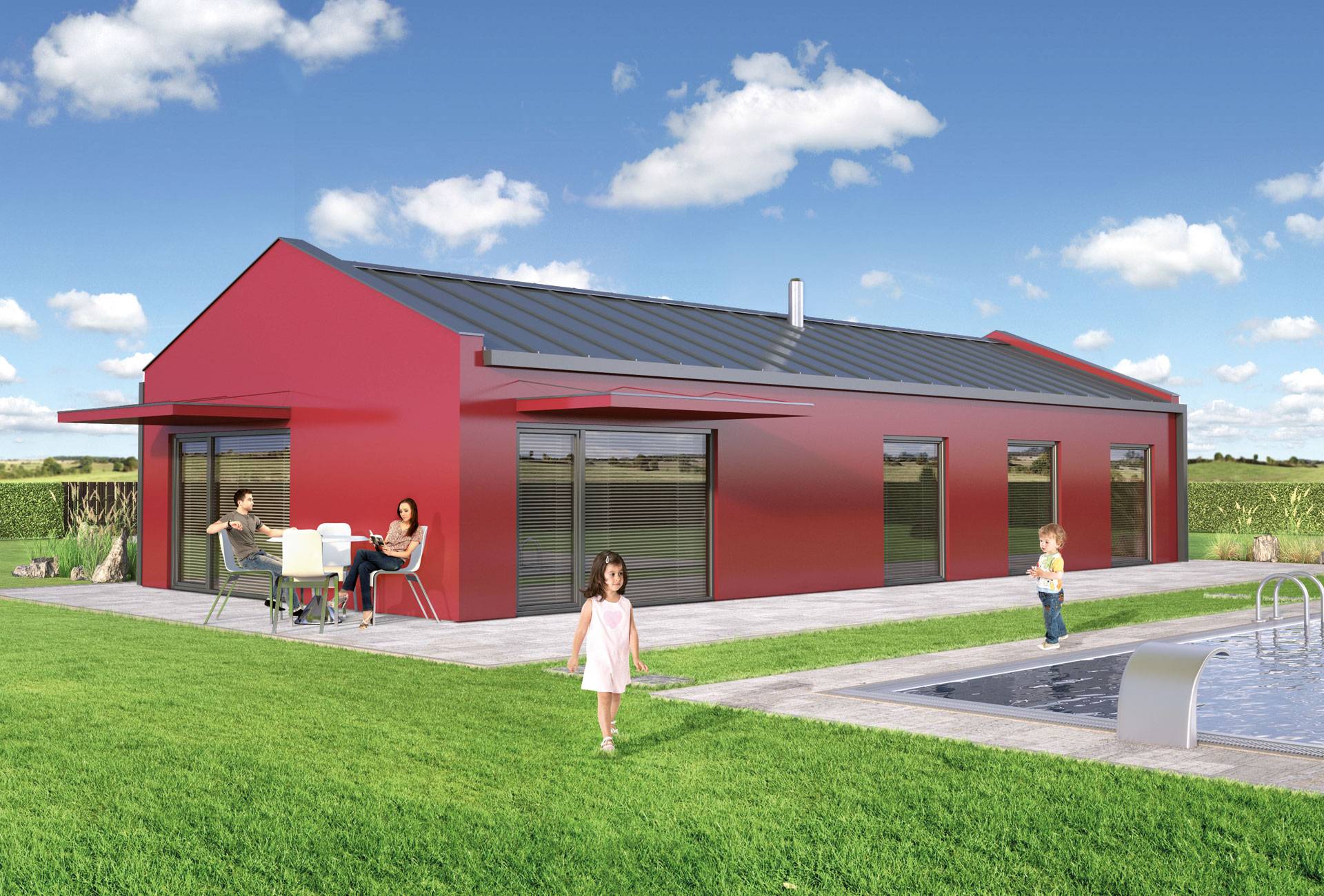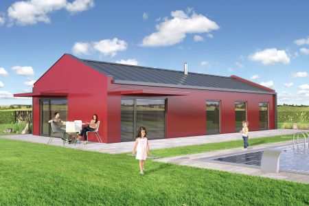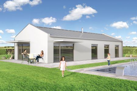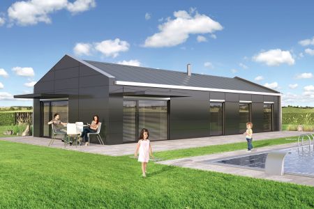 Tento moderní přízemní dům má sedlovou střechou se sklonem 20° a zastřešení řešené pomocí prefabrikovaných dílců.